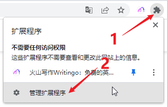 第一步:在 Chrome 或 Edge 浏览器中,点击拼图形状【扩展程序】按钮,再选择展开选项中底部的【管理扩展程序】,进入扩展程序管理页面。