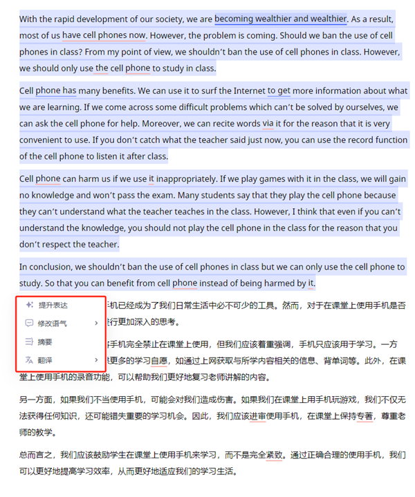 不仅帮助纠正错误,还能提供更优化的表达方式。它会分析文章的句子结构、词汇选择和表达逻辑,给出改进建议,让你的文章更富有表现力和吸引力。