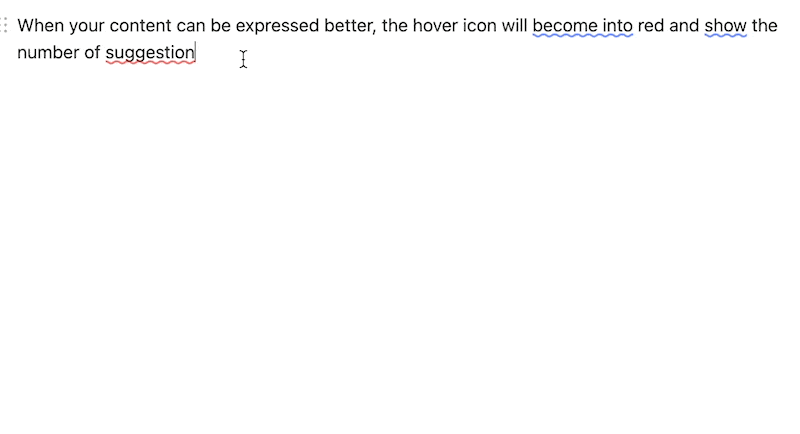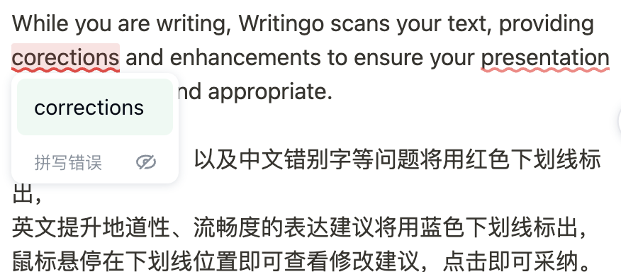 将鼠标悬停在红色波浪线处,即可查看具体修改建议和错误原因,点击绿色按钮即可替换。如果你认为修改建议不适用,点击右下角的眼睛图标即可忽略这条修改建议。