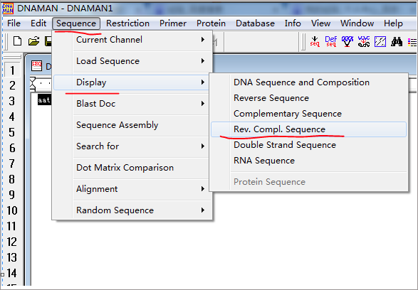4、然后点击软件顶部的Sequence选项,在弹出的选项中点击Display,在二级菜单中点击Rev.Compl.Sequence