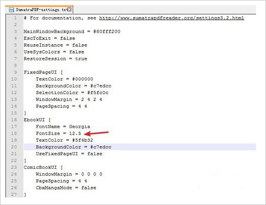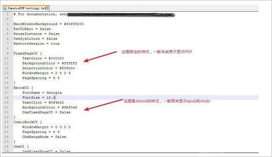 6、除了背景颜色外,配置文件中还有很多内容,我们可以仔细找找哪些是我们需要修改的内容,这里我们如图所示看到,还可以修改epub,mobi文件的字体大小,也是重启后生效,至于PDF的字体则无需修改,按住ctrl+鼠标滚轮就可以放大缩小了。