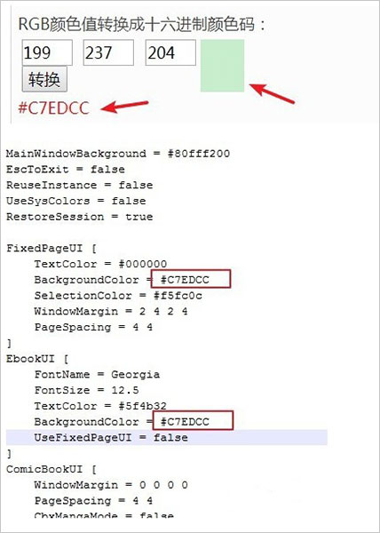 4、对于我们需要修改的背景颜色,我们以护眼色绿色为例,我们可以看到配置文件是以十六进制表示颜色的,因此我们需要进行数值转换,我们在网上找下转换的工具,转换后我们得到护眼色的十六进制数值为C7EDCC,将其复制替换原先BackgroundColor的值,这里修改好数值后如图所示: