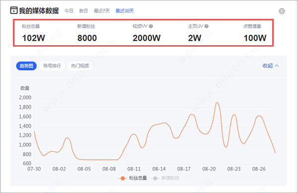 5、显示我的媒体数据界面,在软件查看粉丝总量、新增粉丝数量、视频数量、点赞数量等。