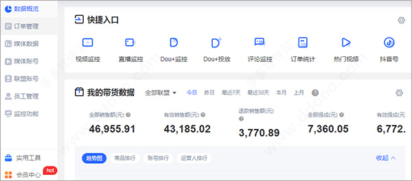 2、登录后,可以看到数据统计界面,可以在后台查看带货数据,显示快捷入口,直接进入视频监控界面,个人带货销售金额在软件直接显示;
