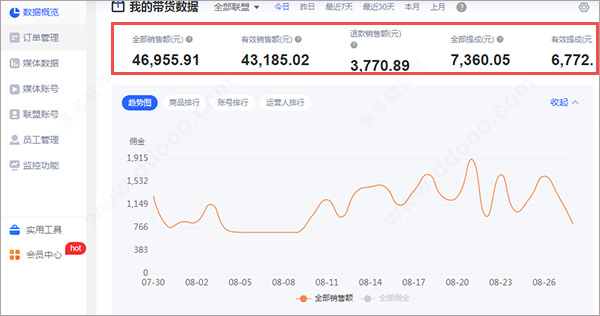 3、可以通过数据图表分析您的销售走势,查看趋势图、商品排行、账号排行、运营人排行;