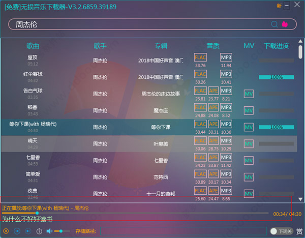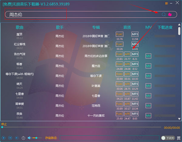 4、右下角是选择下载文件的格式,MP3是普通音质,flac和ape是无损