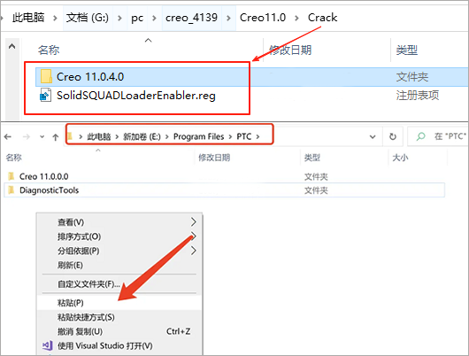 13、打开解压后的安装包,进入【Crack】文件夹。复制图示所有文件。粘贴到图示路径E:\Program Files\PTC(第10步设置的路径)