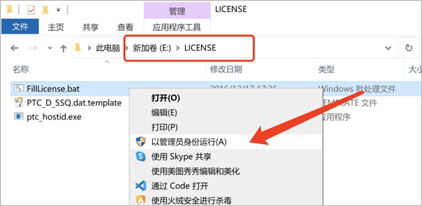 2、粘贴LICENSE文件夹到磁盘根目录(如E盘),然后在LICENSE目录中右键以管理员身份运行【FilLicenset】程序。