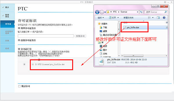 10、将更改好的文件“ptc_licfile.dat”直接拖动到源中,再点击下一步;