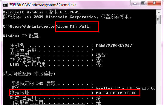 5、依次点击开始菜单--运行--" cmd "--" ipconfig /all "得到物理地址00-E0-6F-10-1D-D6;