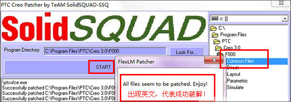 15、打开破解文件,双击“PTC_Creo_Patcher_SSQ.exe”开始激活,选择软件安装目录后【C:\Program Files\PTC\Creo 3.0\F000\Common Files】,再点击start按纽;