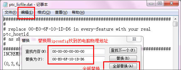 6、编辑菜单--替换--将“00-00-00-00-00-00”全部替换为“00-E0-6F-10-1D-D6”并保存;
