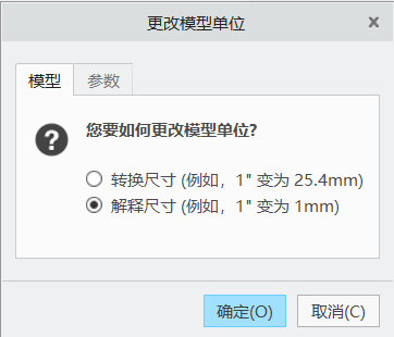 “解释尺寸” 就是单位改变,数值不变,假设原来模型长度是1英寸,转换后则是1毫米