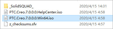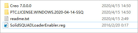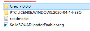2、首先解压_SolidSQUAD_.7z,得到PTC.LICENSE.WINDOWS.2020-04-14-SSQ、Creo 7.0.0.0和SolidSQUADLoaderEnabler.reg注册文件;