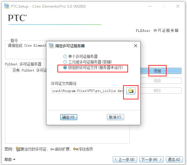 7、点击【添加】,选择【锁定的许可证文件(服务器未运行)】,点击红框内黄色文件夹,再选择设置好的【ptc_licfile.dat】文件;