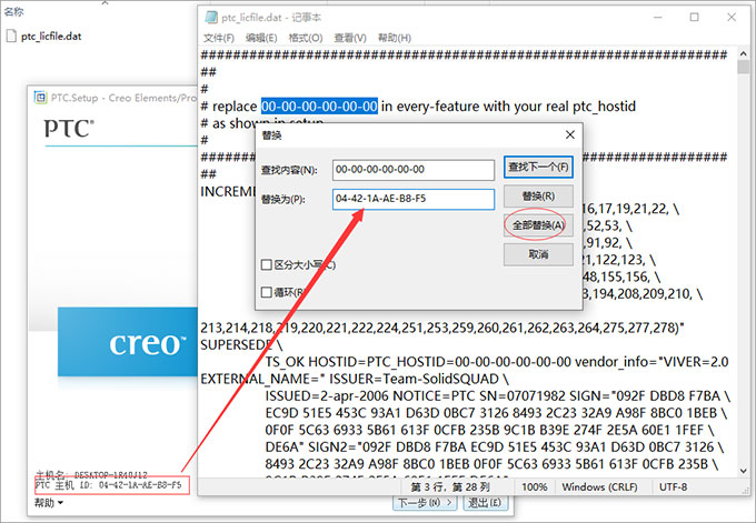 3、找到ptc_licfile.dat,以记事本方式打开,编辑→替换,将00-00-00-00-00-00替换为你电脑的mac地址;