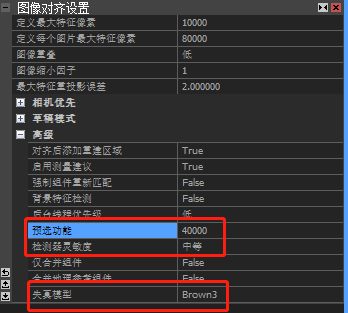 2、点击高级,预选功能设置40000(为定义每个图片最大特征数值的一半),检测器灵敏度设置为中等。