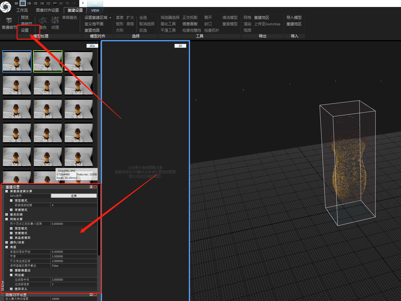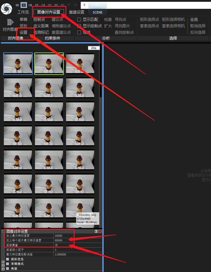 1、点击图像对齐设置工作区,点击设置,将定义每个图片最大特征数值为80000,图像重叠设置为低。
