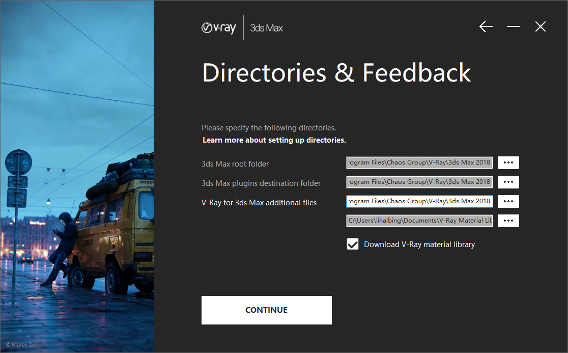 5、软件安装位置更改,这里提供有3dmax以及VRay的安装位置,建议不更改了,点击【CONTINUE】;