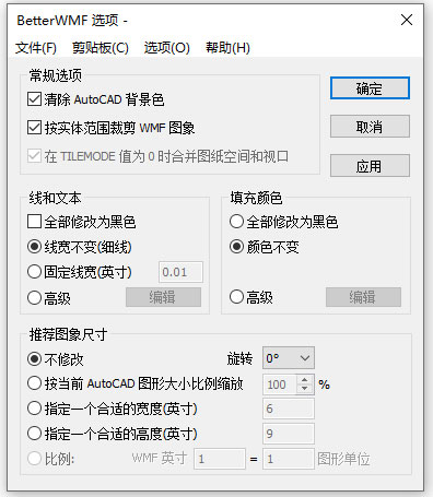 3、如果您使用方法1安装BetterWMF:将ARX加载到AutoCAD中,则可以使用AutoCAD中的BWMFOPT命令访问此对话框。如果您通过方法2使用BetterWMF:在AutoCAD之外运行Bclipbrd.exe,您可以通过双击任务栏中的任务栏图标或单击鼠标右键并选择主选项来访问此对话框