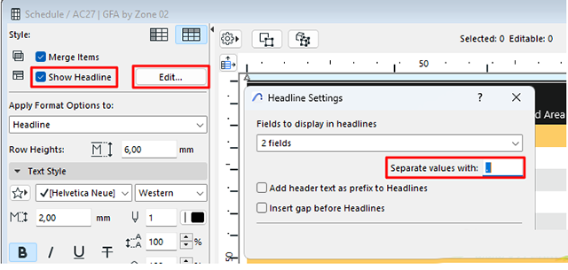 2、通过将列的宽度设置为零来隐藏列 - 这样可以在合并标题单元格时删除不必要的混乱。双击标尺标记可重置列宽,或在“计划单元格大小”对话框中修改宽度。