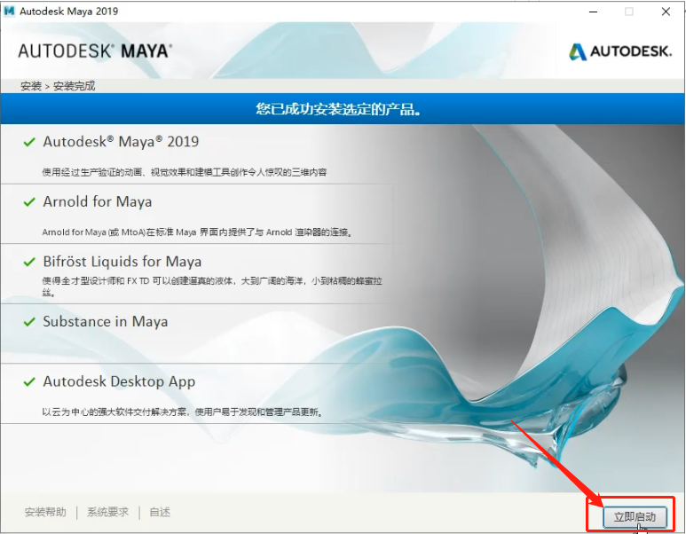7、成功安装后,点击立即启动,对maya2019进行激活操作;