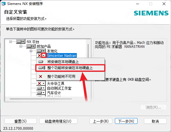4、选择中文简体后,依次点击下图本地化下方-前方有红色“X”图标的项目选择【整个功能安装在本地磁盘上】