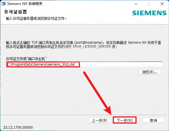 6、输入”端口@主机“【C:\ProgramData\Siemens\siemens_SSQ.dat】,点击【下一步】