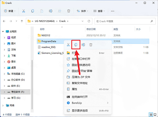 1、下载解压,得到nx2312软件安装包,打开【Crack】文件夹,鼠标右击【ProgramData】文件夹选择【复制】