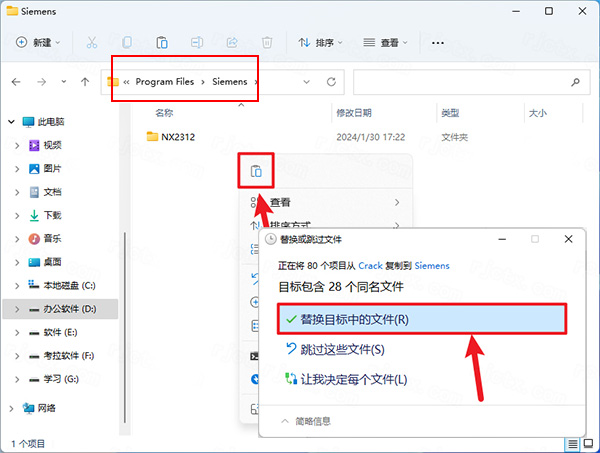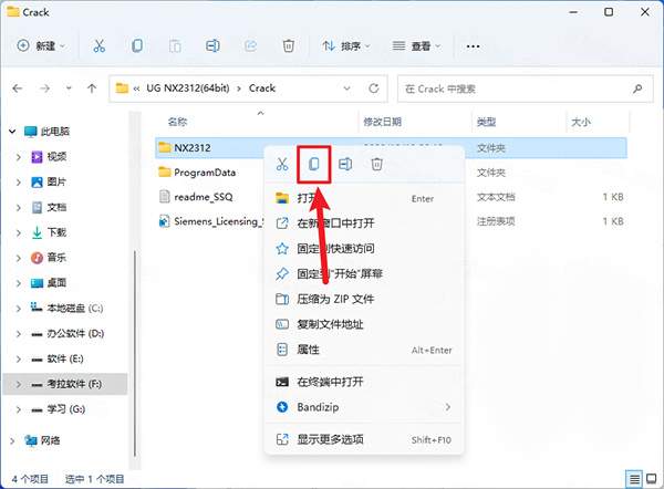 8、回到安装包解压后的【Crack】文件夹,鼠标右击【NX2312】文件夹选择【复制】