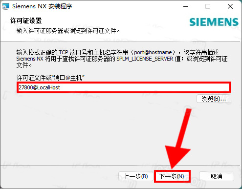 3、选择中文(简体)后,输入许可证文件或端口【27800@localhost】