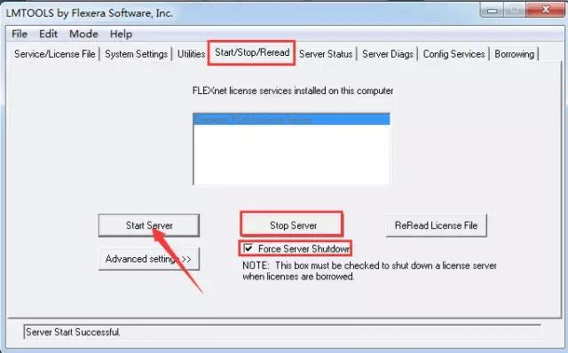 然后点击 Start/Stop/Reread选项,会出现我们配置的一个许可证服务器,点击Stop Server选项,反应一段时间以后,最后一行会出现Stoping Server,如果出现的不是这个停止服务器,我们可以把 Force Server Shutdown前面打上对勾,强制关闭服务器