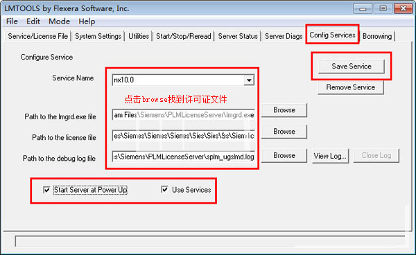 7)点击“config services”选项,在server name框中输入nx10.0,再点击3个browse按纽依次添加相应该的文件;