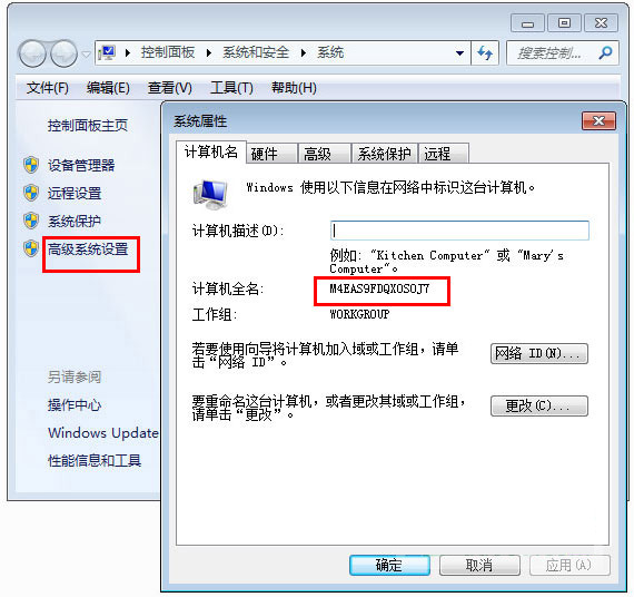 4)桌面上找到“计算机”右击属性--点击“高级系统设置”--复制计算机名称;