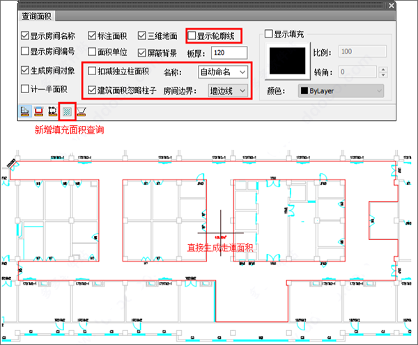 3、改进【查询面积】命令,对话框中“显示房间名称\编号”、“标注面积”和“面积单位”四项改为读取基本设定中的设置;在对话框中增加房间名称的预设,增加是否显示轮廓线、建筑面积是否忽略凸出外墙皮柱子、是否扣减房间内独立柱面积、面积边界是按墙中线还是按墙边线计算的设置;房间面积查询模式下,增加对回字形房间的支持;在查询多段线面积和阳台面积时支持框选批量生成;新增支持查询填充面积;