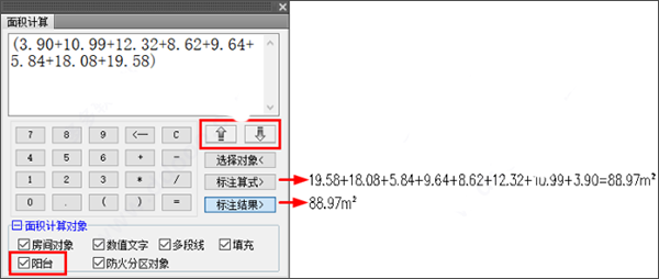 5、改进【面积计算】命令,优化命令操作流程,增加对阳台对象的支持,增加表达式输出功能,对话框支持拖拽修改大小,文字编辑框中的文字实现自动换行和调整字高;