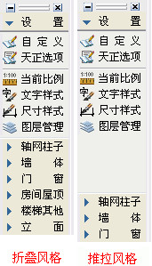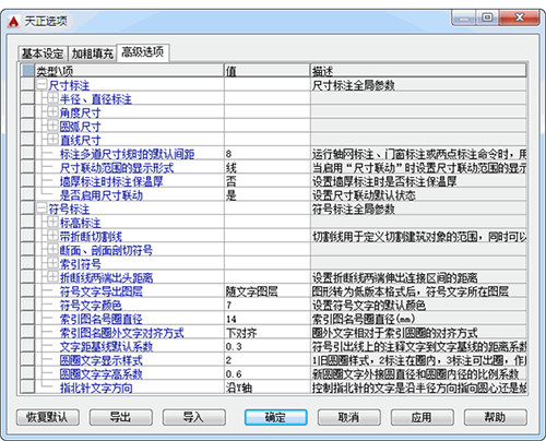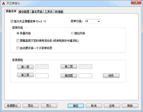 通过【自定义】和【天正选项】可以进行软件界面形式及操作命令方面、建筑设计参数方面的定制设置。此设置可以导出成XML文件,供贵单位其他用户导入,实现参数配置的共享,也可通过“恢复默认”恢复程序最初设置值。
