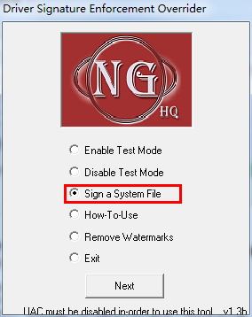 3.再选择第三项“Sign a System File”,点击next。将地址输入即可通过DSEO获得了测试签名认证