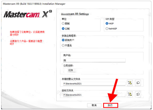 3、点击【Mastercam X9 安装】点击【文件夹图标】可更改安装位置(建议不要安装在C盘,可以在D盘或其它磁盘下新建一个“Mastercamx9”文件夹,注:安装路径中不要有中文),点击【执行】