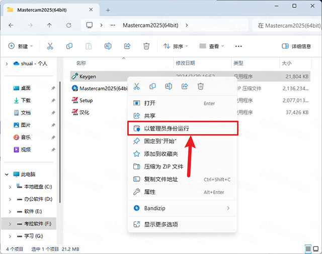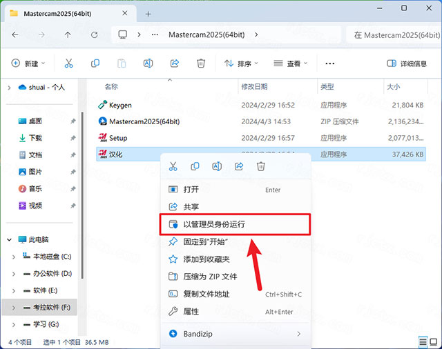 16、打开解压后的【Mastercam2025(64bit)】文件夹,鼠标右击【汉化】选择【以管理员身份运行】