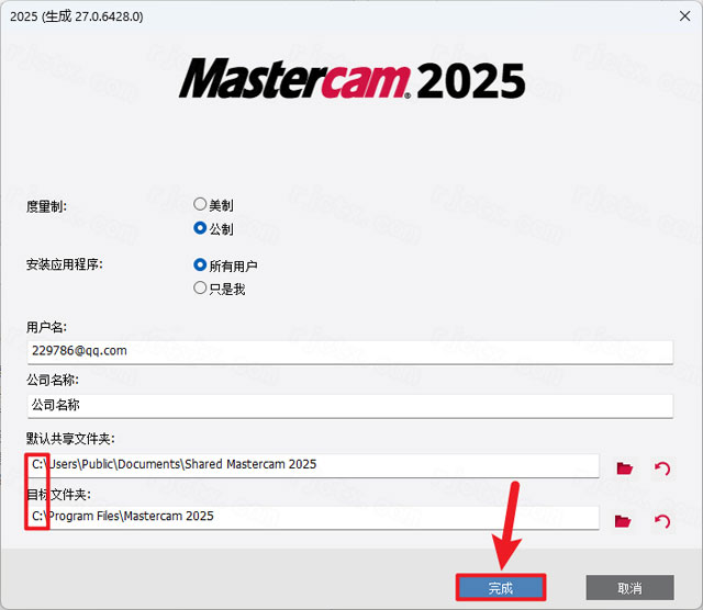 5、修改目标文件夹路径地址中的第一个字符C可更改安装位置(如:把C改为D软件将安装到D盘),点击【完成】
