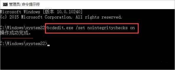 然后把bcdedit.exe /set nointegritychecks on复制到命令窗口,按回车执行即可。
