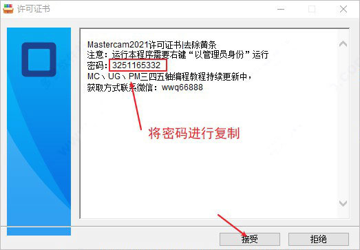 第三步:以管理员的身份运行"Mastercam去除黄条 右键以管理员身份运行.exe"程序,将密码复制下来,点击接受;