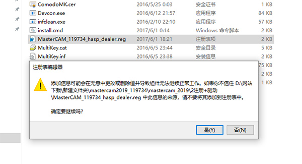 9、打开注册+驱动文件夹,双击运行"MasterCAM_45874_hasp_dealer.reg",点击是;
