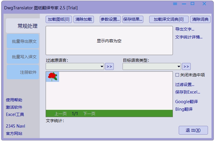 DwgTranslator官方版是绘图翻译行业中一款非常有用的工具,具有常规处理、批量导出原文、批量写入译文等主要功能,提供过滤器设置,Google翻译、Bing翻译等辅助工具。支持全球所有主要语言,对结果输出与新文本字体、大小、高度、颜色可以进行调整。DwgTranslator运行不受CAD绘图环境支撑,安装后可直接运行,不需要依赖其它软件。界面简洁,布局设计合理,能自动解析图纸分析文本内容,所有常规操作均可自动化执行,极大的提高流程效率,感兴趣的请下载。