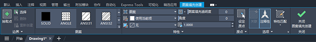 注: 选择图案填充对象,即会显示“图案填充编辑器”功能区选项卡。此选项与“图案填充创建”功能区选项卡非常相似。