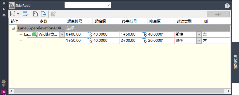 在图形中,选择要过渡的部件和要过渡的参数,然后选择桩号、值和过渡类型。