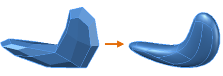 例如:首次修改图示中的三维网格,方法为增加其平滑度,然后将其转换为平滑的三维实体。