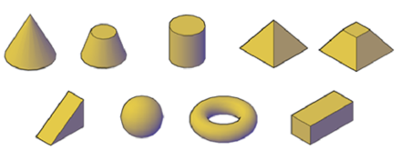 可以使用诸如 CYLINDER、PYRAMID 和 BOX 等命令来创建多种基本三维形状(称为实体图元)。