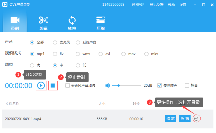 打开QVE屏幕录制软件,主界面选择【录制】,点击开始录制按钮或快捷键Alt+F8,开始录屏,如果需要结束录屏,点击停止录制按钮或快捷键Alt+F12停止录制,录制的文件保存在本地,点击更多操作,打开目录。